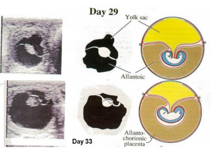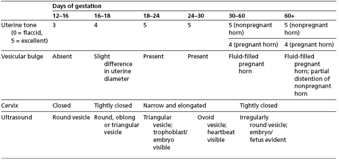 Durante la gestación los cuernos uterinos se agrandan, lo que es detectado alrededor de los 20 -30 días, la cavidad alantoidea tiene un rápido desarrollo desde la 5 - 7a semana conteniendo mucho liquido.