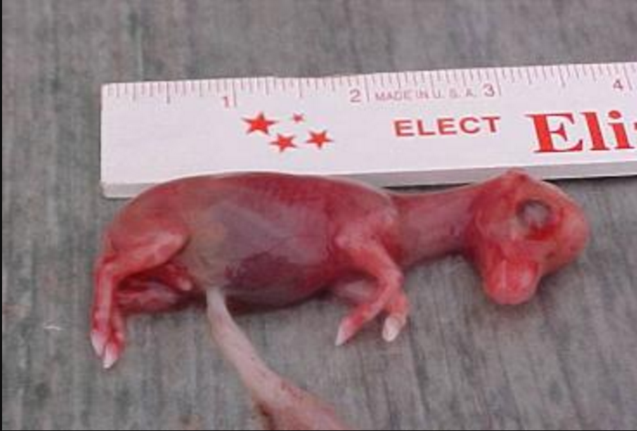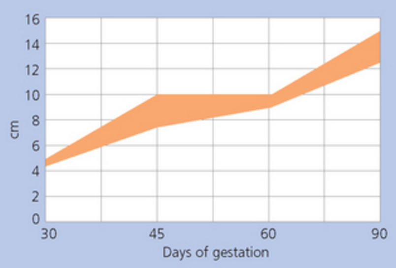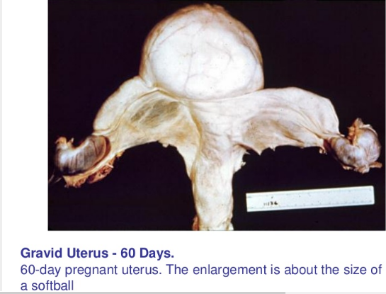 A los 14-18 días, el útero grávido empieza a engrosarse y aumenta su tono. A los 18 días el saco fetal es del tamaño de un huevo estándar de gallina en el primer mes.
