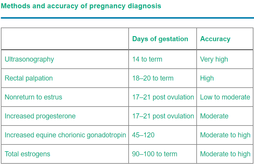 ´El examen rectal después de 30 días es probablemente el método más económico de diagnóstico, pero la experiencia y la habilidad del operador son factores importantes. Hay riesgos importantes (inevitables) involucrados en el examen rectal de cualquier yegua.